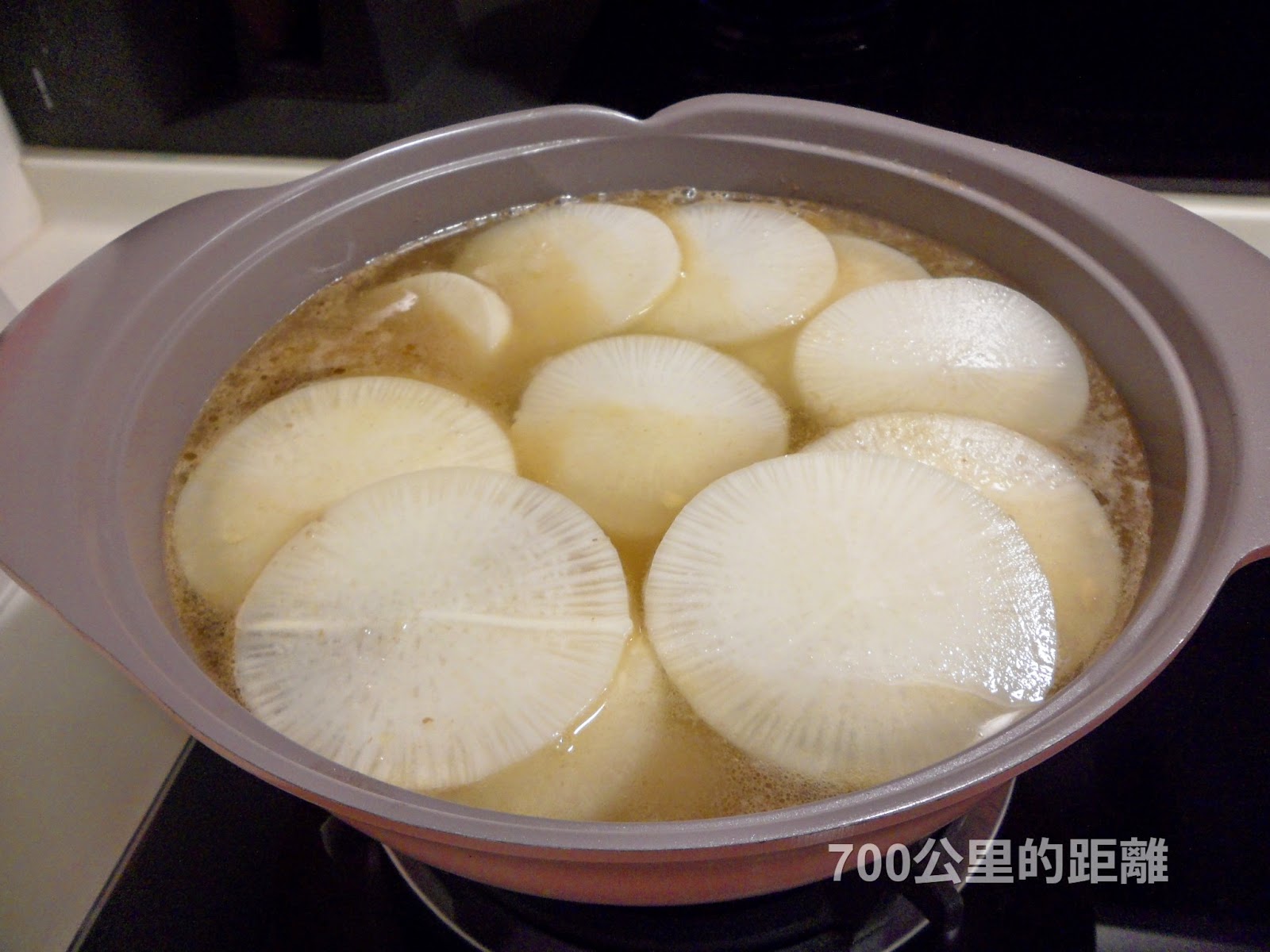 放入蘿蔔片,水燒開1分鐘左右,幫蘿蔔翻身,再燒開後換中火燒3分鐘,蓋蓋子、關火。