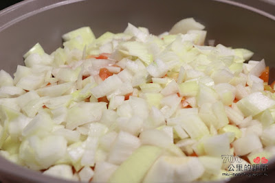將番茄和洋蔥掉進鍋裡,蓋上蓋子,開小火煮1分鐘,轉中火