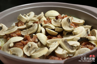 幾分鐘後,看到冒煙即可把肉和蘑菇(洋菇)倒進去,蓋上蓋子煮8分鐘